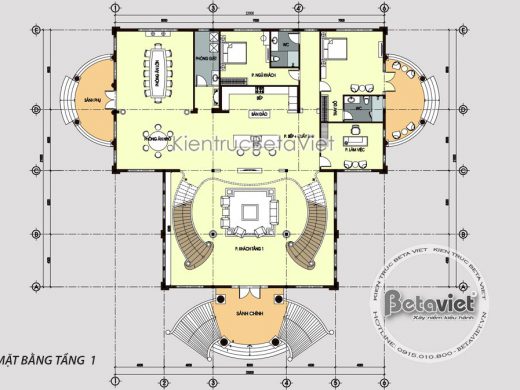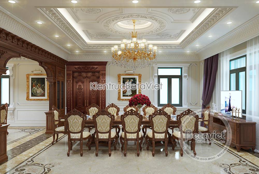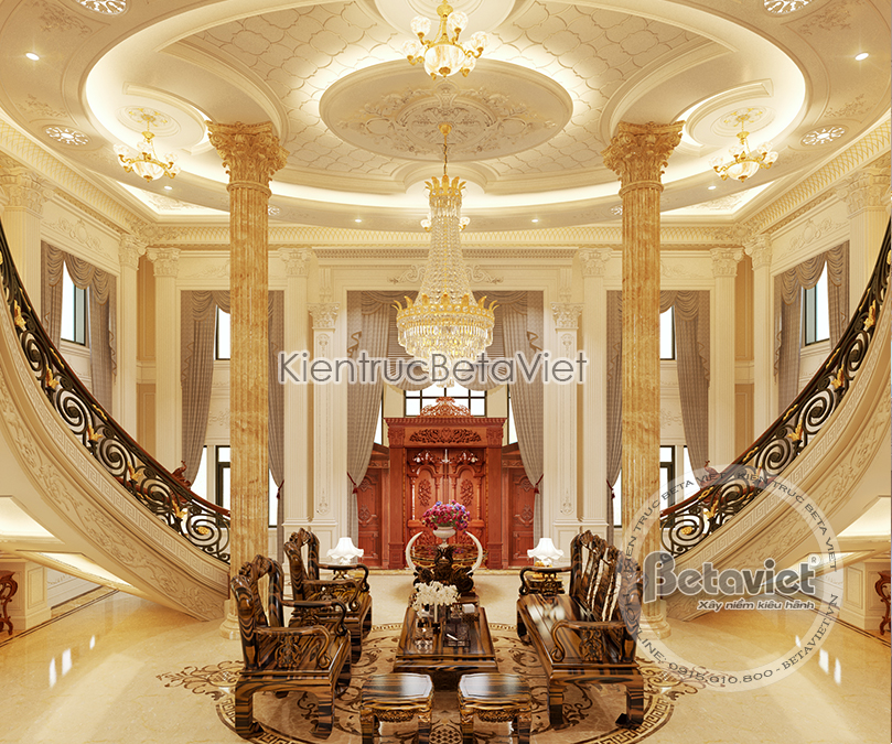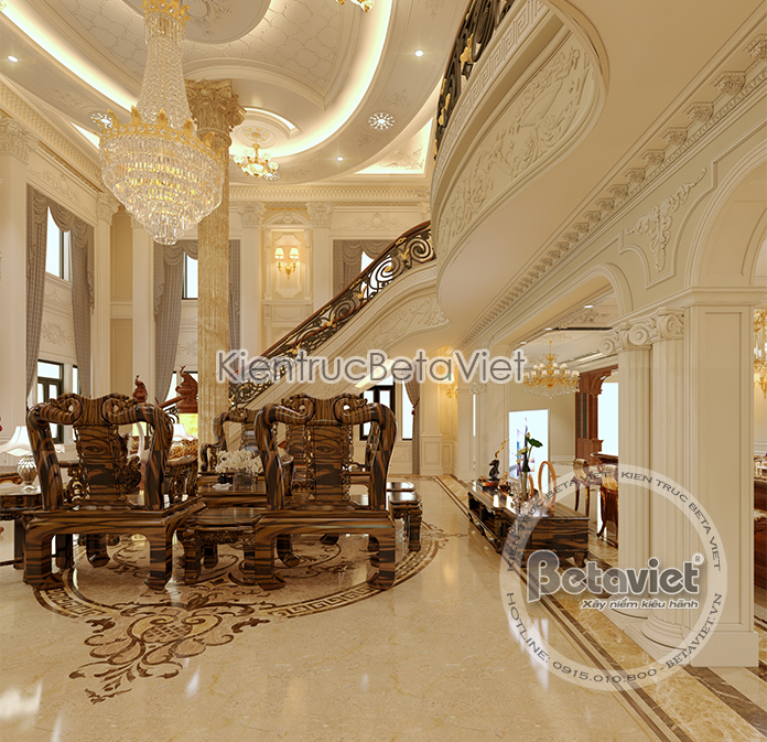 Dinh thự xây trên một diện tích mặt bằng mặt tiền 31m, chiều sâu 27m, một diện tích được coi là quá rộng khi cả một khu đất lên đến hơn 600 m2. Trên một mảnh đất có giá trị như vậy, thiết kế như thế nào để có được một công trình kiến trúc đẳng cấp tương xứng là một thách thức không nhỏ đối với các kiến trúc sư của Beta Việt. Nhưng với trình độ thiết kế đỉnh cao, sức sáng tạo tuyệt vời, các nhân tài ở Beta Việt đã tạo nên một tuyệt tác kiến trúc dinh thự. Phong cách Tân cổ điển là một giải pháp tối ưu khi ngoại thất đã loại bỏ gần hết các chi tiết trang trí phụ trợ như những hoa văn, những bức phù điêu giả  điêu khắc trên thạch cao hoặc xi măng. Khối nhà là một khối hình học cân xứng, không chỉ nói về tổng thể mà các chi tiết phụ như sảnh, cửa sổ, khối mái, cũng được làm cân xứng để hài hòa với công trình chung. Cảnh quan bên ngoài được chú trọng thiết kế, phần phía trước tạo đường vào như một bảo tàng, một cung điện xa hoa, có hệ thống đài phun nước và hàng hoa dọc theo 2 bên đường. Trong khu vườn, hệ thống thực vật rất phong phú, nở hoa bốn mùa, mát mẻ, thanh tịnh.