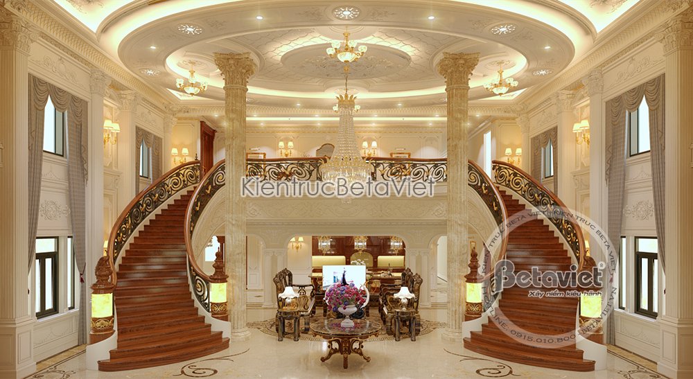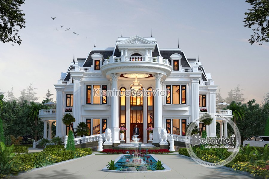 Sự xa hoa trong thiết kế không cần đến từ những chi tiết quá nhỏ nhặt mà nó toát lên qua những cánh cửa rộng lớn, qua các khối trụ, cột, các kết cấu Baroque  hay đại sảnh đón hình tròn cầu kỳ như một cung điện nguy nga. Cạnh cửa ra vào đặt 2 con hổ lớn, như khí thế vương giả, như tầm vóc của chủ nhà. Thiết kế trên một mặt bằng rộng, không cần phải quá cao, chỉ cần 2 tầng là đủ không gian sinh hoạt cho gia đình, thiết kế quá cao che khuất phần cảnh quan, khiến cho công trình trở nên chật chội và thừa thãi không gian. Bốn trụ tròn kiểu Ionic cùng khối mái sảnh tròn tạo nên một nơi bước vào, nơi đón tiếp rất lịch sự và trang hoàng. Phần trụ Corinth xung quanh tuy chỉ trang trí phần đầu cột nhưng vẫn toát lên được phong cách quý tộc châu Âu. Căn nhà sử dụng màu trắng, làm nổi bật các chi tiết như cửa sổ, kính, ánh đèn nội thất và khối mái. Kiểu mái Mansard càng tôn dáng căn nhà, đặt trên một thiết kế càng tăng vẻ đẹp hoàng gia và khí thế đồ sộ, lại tạo được thêm một tầng áp mái, giúp giảm nhiệt bên trong cho công trình, phủ bên ngoài bằng tấm lợp giả ngói.