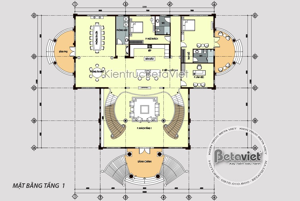 1. Diện tích tầng 1: 394m2 + 20m2 Sảnh chính + 40m2 Hai sảnh phụ